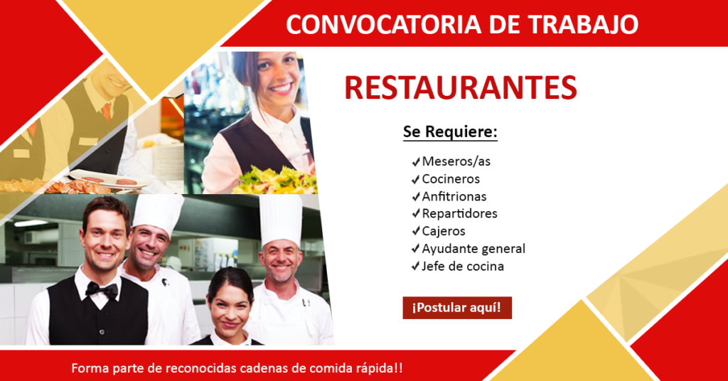 Diferentes cadenas de restaurantes buscan personas dinámicas, trabajadoras y con ganas de superación de diferentes edades para ocupar los siguientes cargos: Anfitrionas, mozos, cocineros, personal de aseo, repartidores motorizados, entre otras áreas necesarias